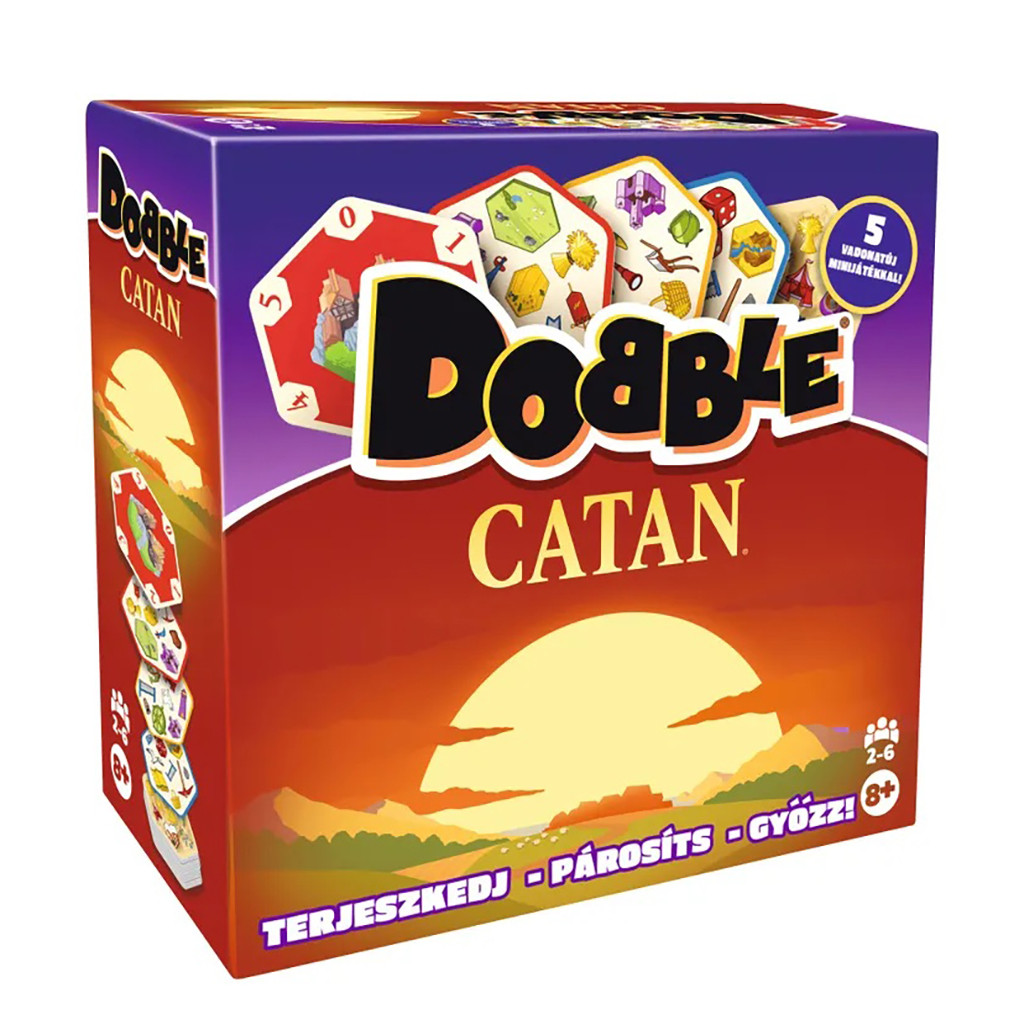 A Dobble Catan egy egyedülálló társasjáték, ahol a klasszikus Catan világát ötvözték a Dobble gyorsasági mechanikájával. Ebben a különleges játékmenetben az lesz a győztes, aki a leggyorsabban találja meg az azonos szimbólumokat, miközben utakat épít, kikötőket hódít, vagy szigeteket fedez fel.