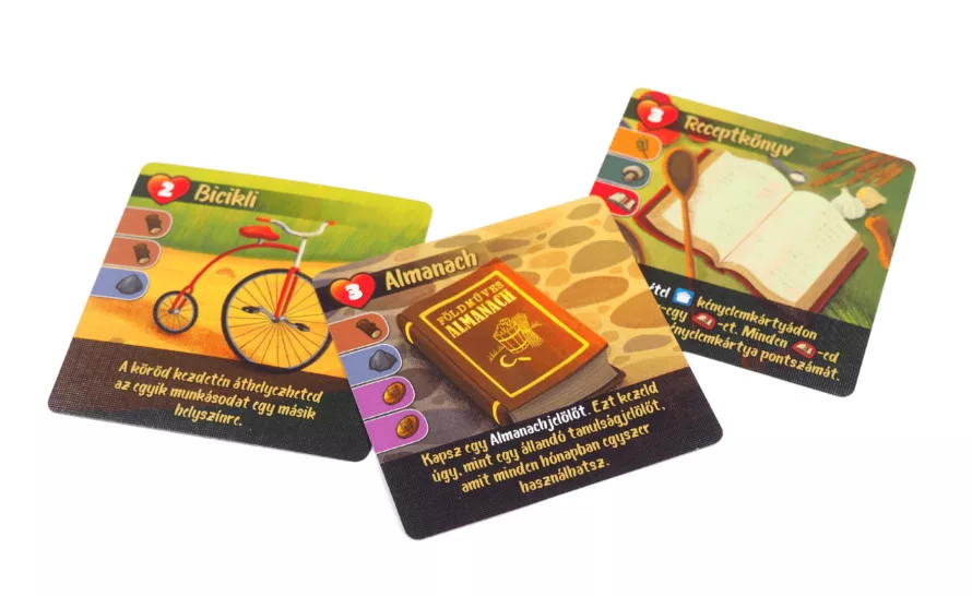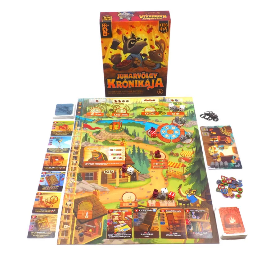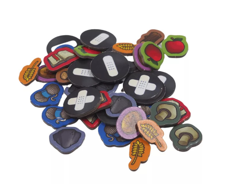 1 játéktábla, 15 látógatókártya, 16 völgykártya, 72 kényelemkártya, 34 fejlesztéskártya, 5 otthontábla, 20 fa munkásfigura, 20 fa kunyhófigura, 10 családkocka, 4 falukocka, 1 folyótárcsa, 1 hegytetőlapka, 1 fő kukacjelölő, 2 talicskajelölő, 2 almanachjelölő, 20 karton érme, 20 történetjelölő, 21 tanulságjelölő, 20 fajelölő, 20 kőjelölő, 20 gyümölcsjelölő, 18 gombajelölő, 18 fonaljelölő, 18 gabonajelölő, 12 többszöröző lapka és 1 szabálykönyv