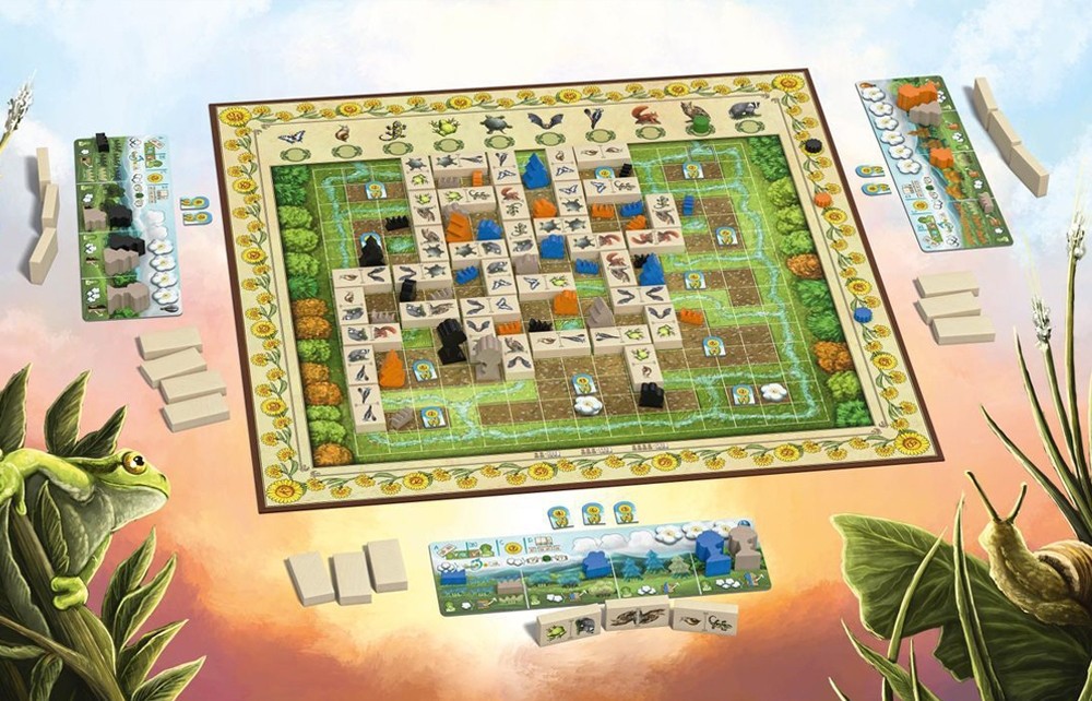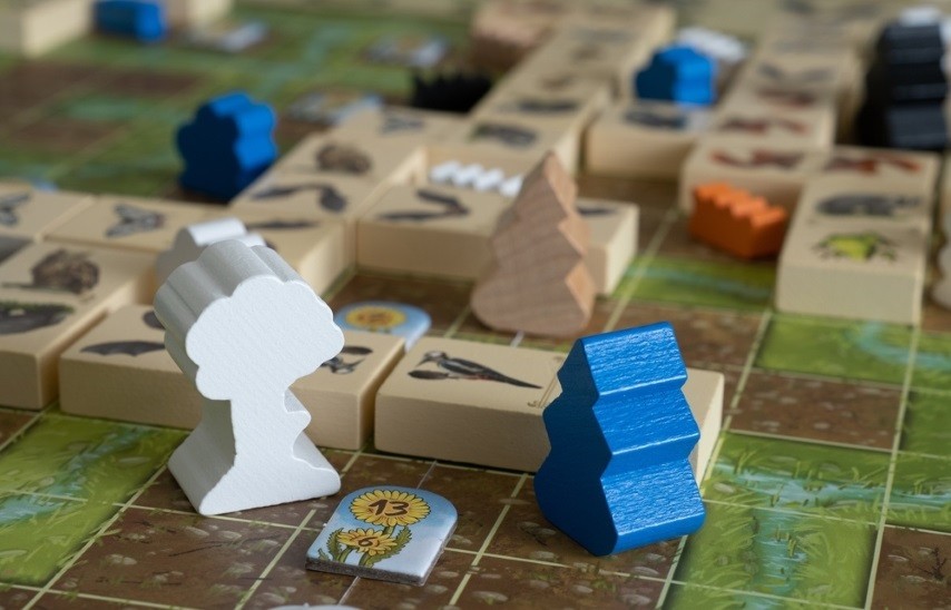On your turn, place one of the three dominoes in your hand on two brook spaces of the valley board. Of course, the domino must be adjacent to another domino that shows the same animal. If the placed domino borders a free space of a brown area, you can decide whether a tuft of grass or any other of your plants should be placed on that space. Tufts of turf have a value of 1, bushes of 2, pines of 3 and oaks of 4. After placing the plant, you score points for it and every plant piece that is already in this brown area and has the same or a lower value.