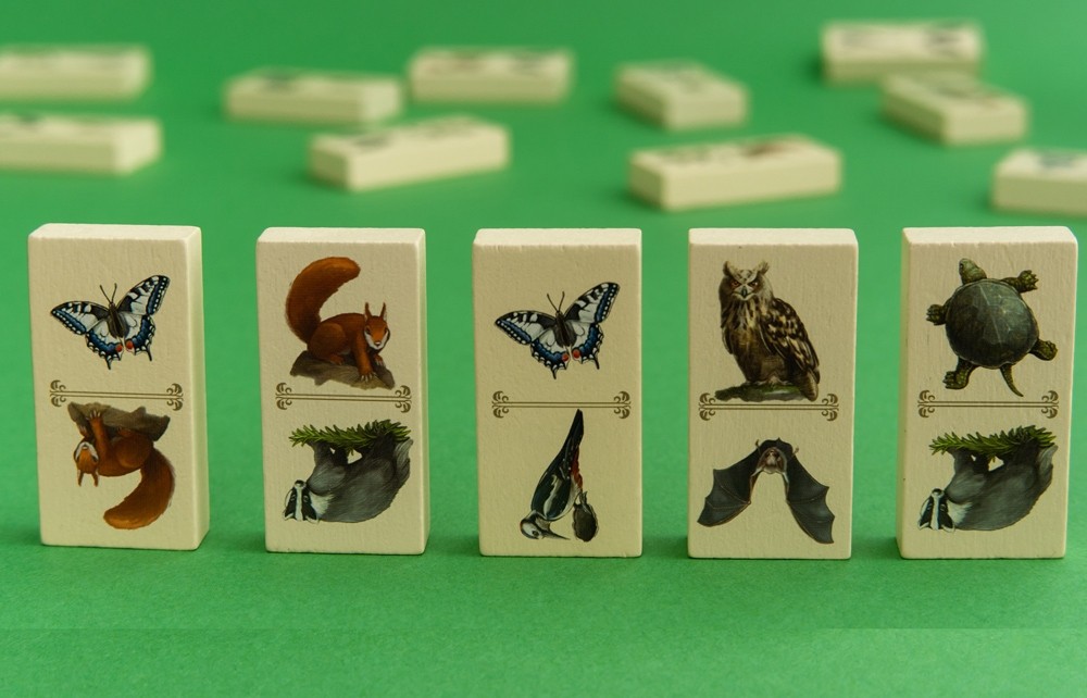 Each player gets a board with large pieces of wood in the form of turf, bushes, pines and oaks. These plants are used for the majorities on the large valley board and are available in a neutral color and in the respective player color. In addition, each player gets a stack of dominoes with two out of ten animal motifs on each of them.