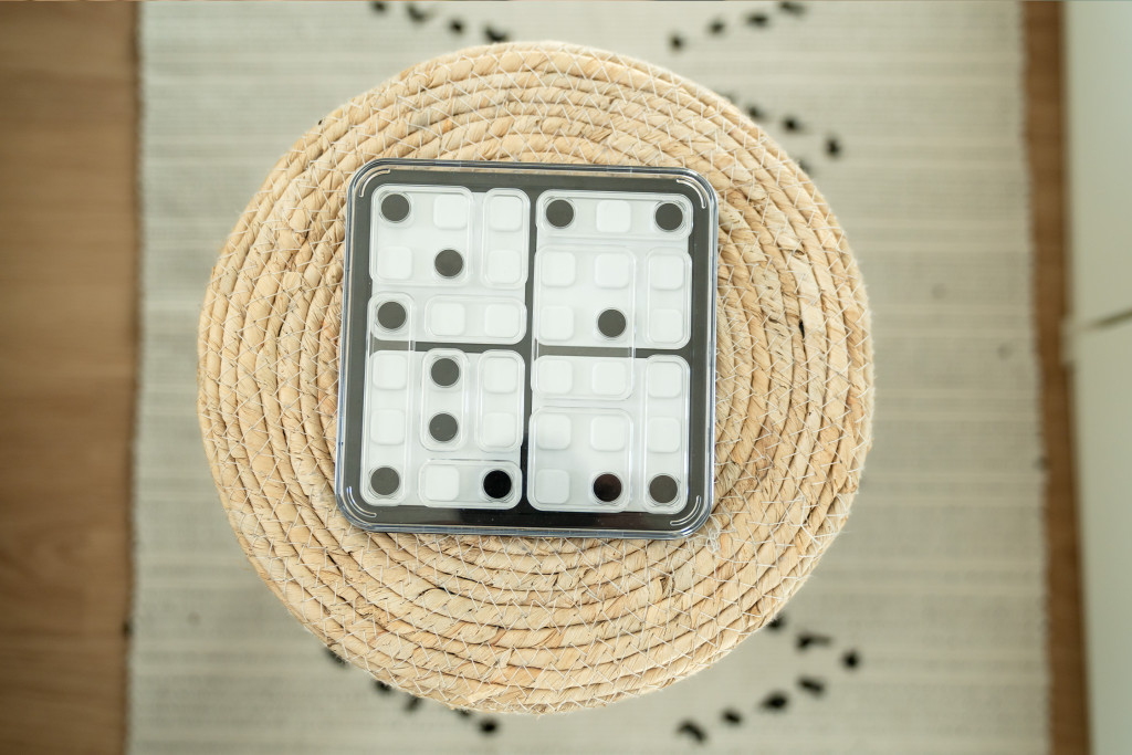 Helyezd el a kirakódarabokat úgy, hogy a fekete pöttyök a feladványban látható helyekre kerüljenek. A dobókocka oldallapokon lévő  öttyök száma egyezzen meg a nyilakban jelölt számmal. Minden feladványhoz egyedi megoldás tartozik. Dobókockázatra fel!